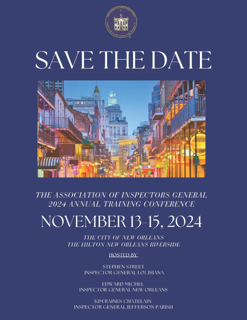 The Association of Inspectors General (AIG) is pleased to announce that the 2024 Annual Training Conference will be held in New Orleans, Louisiana on November 13th - 15th, 2024. We are also excited to announce that our networking event will be held at the renowned National WWII Museum. Mark your calendars and check here for updates!